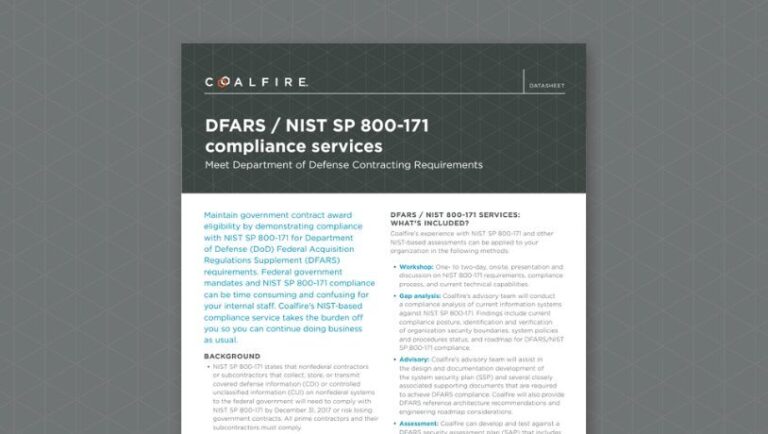 Maintain government contract award eligibility by demonstrating compliance with NIST 800-171 for Department of Defense (DoD) Federal Acquisition Regulations Supplement (DFARS) requirements. Federal government mandates and NIST 800-171 compliance can be time consuming and confusing for your internal staff. Coalfire Federal’s NIST-based compliance services takes the burden off you so you can continue doing business as usual.